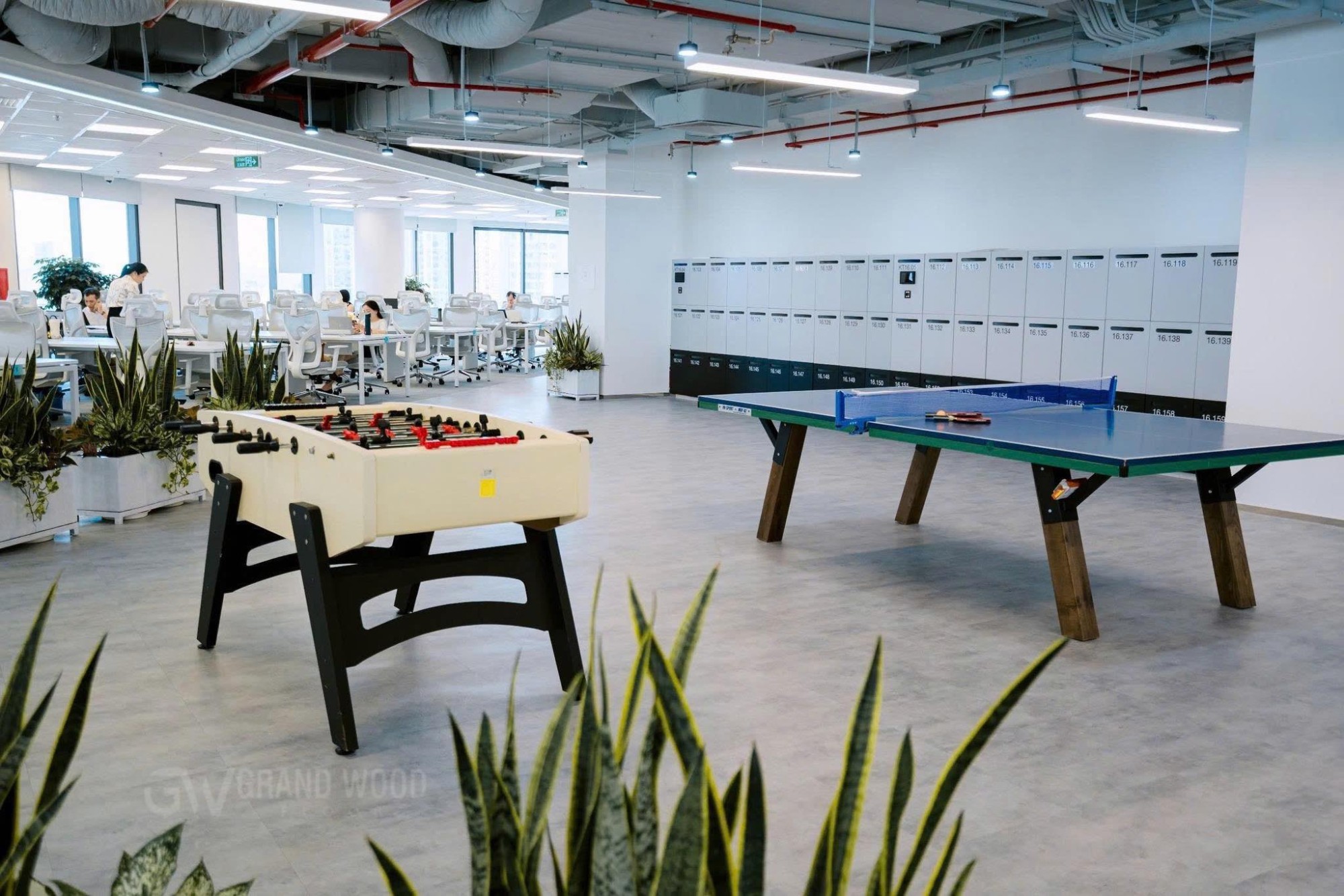 Tại khu vực làm việc, tông màu xám sáng của sàn giúp phản chiếu ánh sáng tự nhiên, tạo nên cảm giác rộng rãi và sạch sẽ. Khu vực thư giãn, nơi bố trí bàn bi lắc, bàn bóng bàn và các mảng cây xanh, trở nên gần gũi và thoải mái hơn nhờ bề mặt sàn êm, ít tiếng ồn. Từng khu vực tuy khác chức năng, nhưng nhờ màu sàn đồng bộ, tổng thể văn phòng vẫn liền mạch và tinh tế.