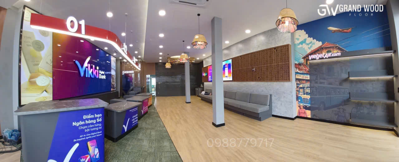 Trong bối cảnh ngành tài chính – ngân hàng đang chuyển mình mạnh mẽ theo xu hướng số hóa, không gian giao dịch không chỉ cần đảm bảo công năng mà còn phải thể hiện được hình ảnh thương hiệu hiện đại, chuyên nghiệp và thân thiện với khách hàng. Việc lựa chọn vật liệu hoàn thiện, đặc biệt là sàn nhà, đóng vai trò vô cùng quan trọng trong việc tạo nên trải nghiệm tổng thể cho người sử dụng. Với kinh nghiệm nhiều năm trong lĩnh vực cung cấp và triển khai sàn vật liệu hoàn thiện cao cấp, Grand Wood tự hào là đơn vị được Vikki Bank tin tưởng lựa chọn làm đối tác cung cấp giải pháp sàn vinyl cho hệ thống chi nhánh trên toàn quốc. Đây không chỉ là một dự án tiêu biểu mà còn là dấu ấn khẳng định năng lực của Grand Wood trong việc đồng hành cùng các công trình chuỗi có yêu cầu cao về chất lượng, tiến độ và tính đồng bộ.