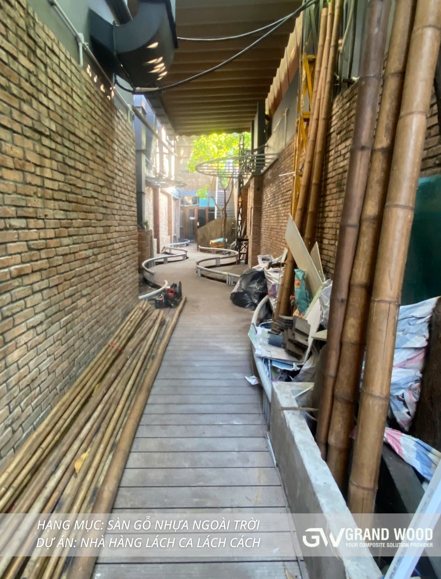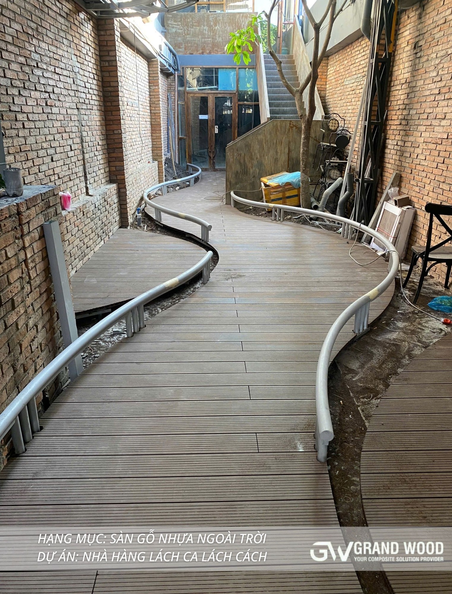 Một trong những điểm nhấn ấn tượng nhất tại dự án Lách Ca Lách Cách chính là hệ thống lối đi được thiết kế uốn lượn mềm mại, phá vỡ sự thô cứng của những bức tường gạch mộc. Khác với gỗ tự nhiên vốn dễ nứt vỡ khi cắt xẻ phức tạp hoặc gỗ thanh thẳng đơn điệu, sàn gỗ nhựa Grand Wood cho phép các kiến trúc sư thực hiện những đường cong ngẫu hứng đầy tính nghệ thuật. Việc thi công những đoạn bo góc, uốn lượn đòi hỏi vật liệu phải có độ dẻo dai nhất định và khả năng chịu lực đồng nhất. Từng thanh gỗ nhựa được cắt gọt tỉ mỉ, lắp ghép chuẩn xác đến từng milimet, tạo nên một dải lụa nâu trầm ấm áp dẫn lối thực khách. Chính khả năng tùy biến cao này đã giúp tối ưu hóa những góc chết trong không gian nhà hàng, biến những lối đi hẹp trở thành một hành trình trải nghiệm thị giác đầy thú vị và phong cách.