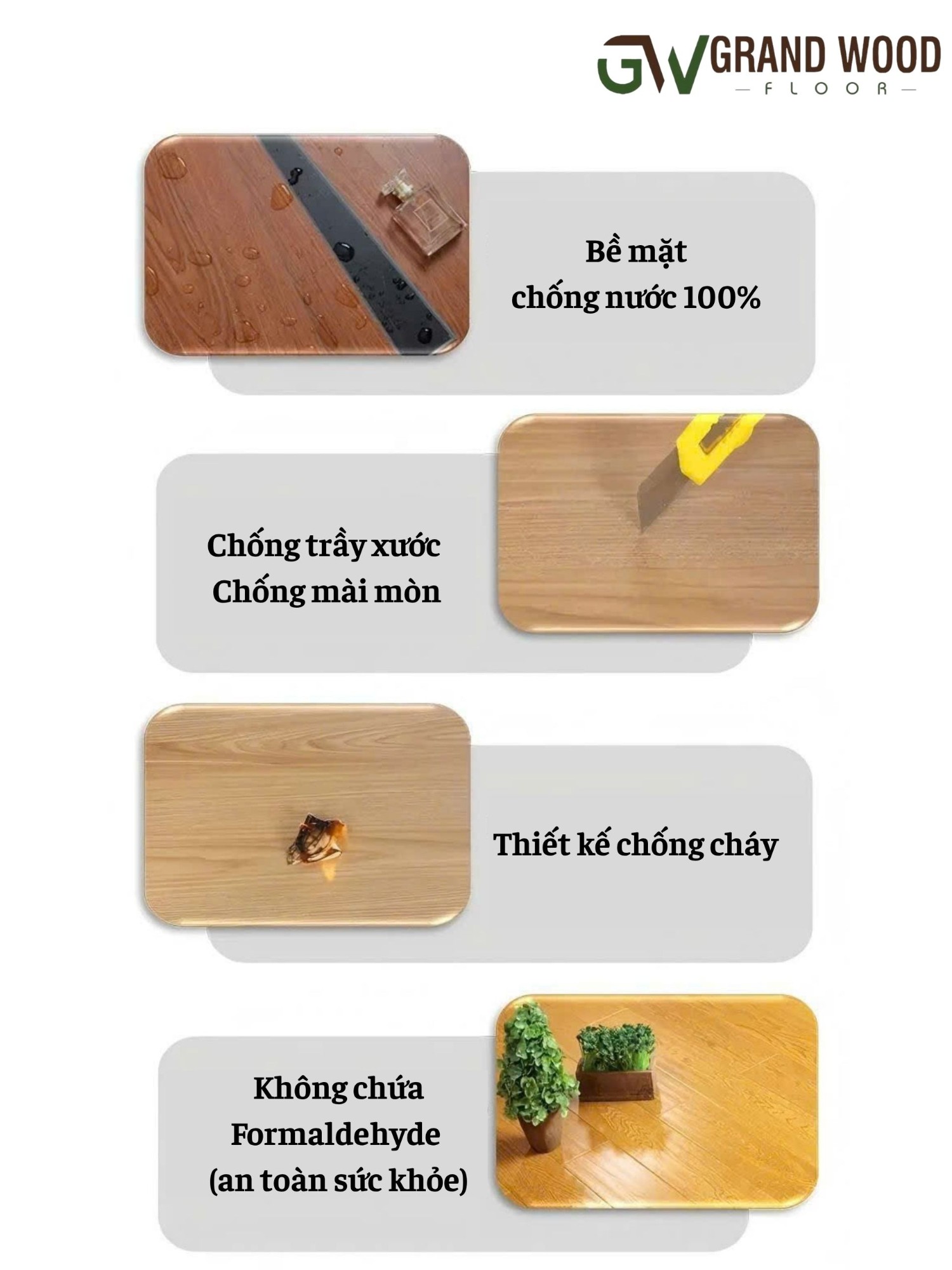 Điểm nổi bật nhất giúp sản phẩm Grand Wood được ưa chuộng là khả năng chống nước 100%, cho phép sử dụng trong bếp, nhà vệ sinh khô, khu vực gần cửa ban công mà không lo giãn nở hay phồng rộp. Lớp phủ bề mặt chống trầy xước và chống mài mòn giúp sàn luôn giữ được độ mới sau thời gian dài sử dụng, phù hợp cả với những gia đình có trẻ nhỏ hoặc thú cưng. Một ưu điểm đáng giá khác là khả năng chống cháy, giúp hạn chế lan lửa khi xảy ra sự cố, đảm bảo an toàn tối đa. Sàn SPC Grand Wood không chứa Formaldehyde – chất độc thường có trong các loại ván ép – nên đặc biệt an toàn cho trẻ em, người lớn tuổi và những gia đình ưu tiên sức khỏe. Ngoài ra, mức chi phí hợp lý, tuổi thọ cao cùng khả năng lắp đặt nhanh chóng cũng là lý do khiến Grand Wood trở thành lựa chọn kinh tế cho nhiều hộ gia đình và nhà thầu.