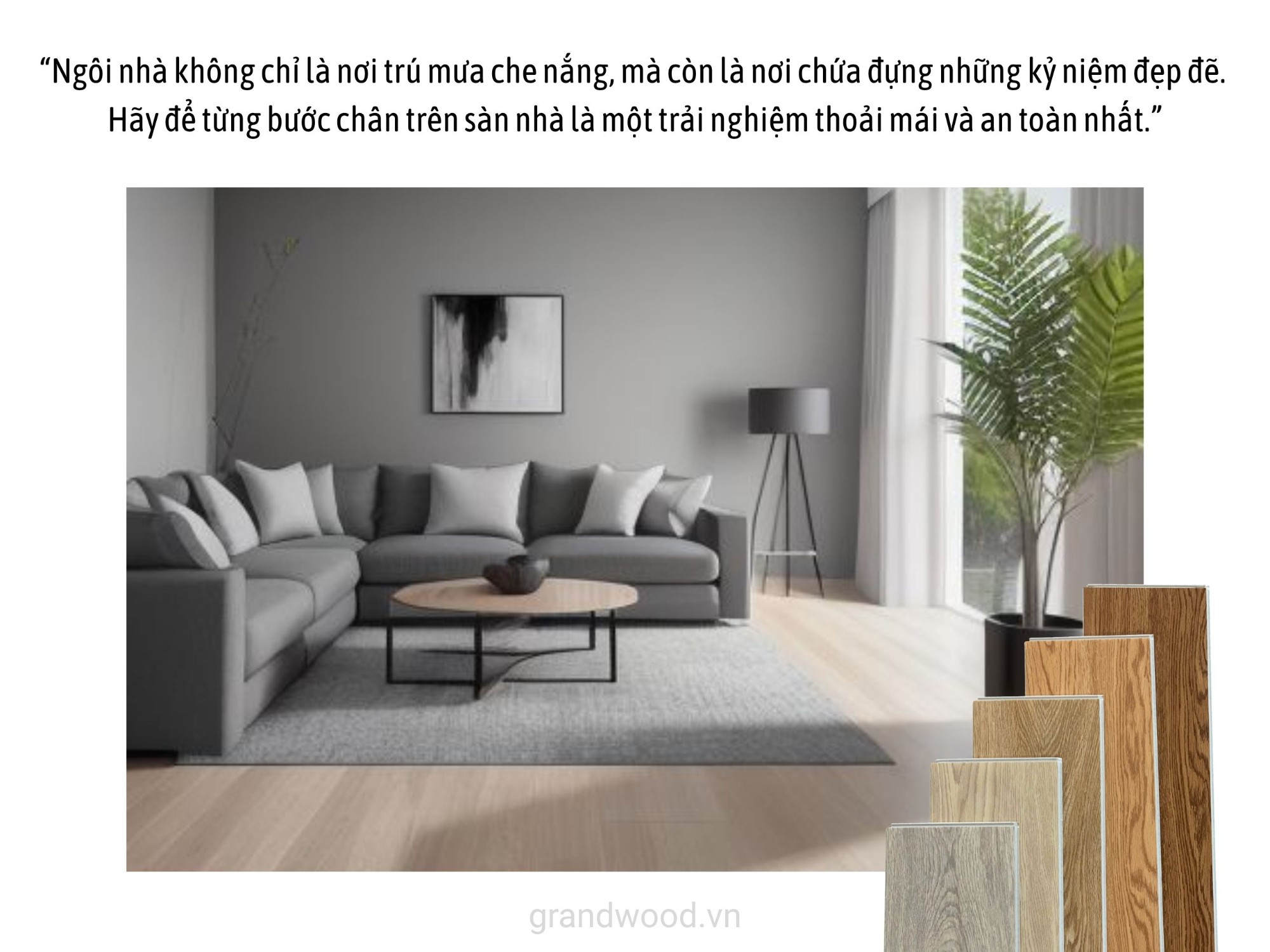 Grand Wood không chỉ cung cấp một loại sàn, mà mang đến một giải pháp tổng thể kết hợp giữa độ bền, tính thẩm mỹ và sự an toàn cho sức khỏe. Từng sản phẩm được sản xuất theo quy trình hiện đại, kiểm duyệt nghiêm ngặt nhằm đảm bảo chất lượng ổn định cho người dùng. Khả năng cách âm tốt, chống trơn trượt, chống va đập giúp sàn thích hợp với gia đình có người già và trẻ em – những đối tượng cần sự an toàn tối ưu. Bên cạnh đó, thiết kế tinh tế và bảng màu đa dạng giúp Grand Wood phù hợp với mọi phong cách, từ đơn giản đến sang trọng. Khi lựa chọn Grand Wood, bạn không chỉ đầu tư cho vẻ đẹp không gian mà còn đầu tư cho sự bền vững và an toàn lâu dài. Đây là giải pháp sàn lý tưởng cho những gia chủ đề cao giá trị sống, yêu thích sự tinh tế và mong muốn sở hữu một tổ ấm trọn vẹn theo thời gian.