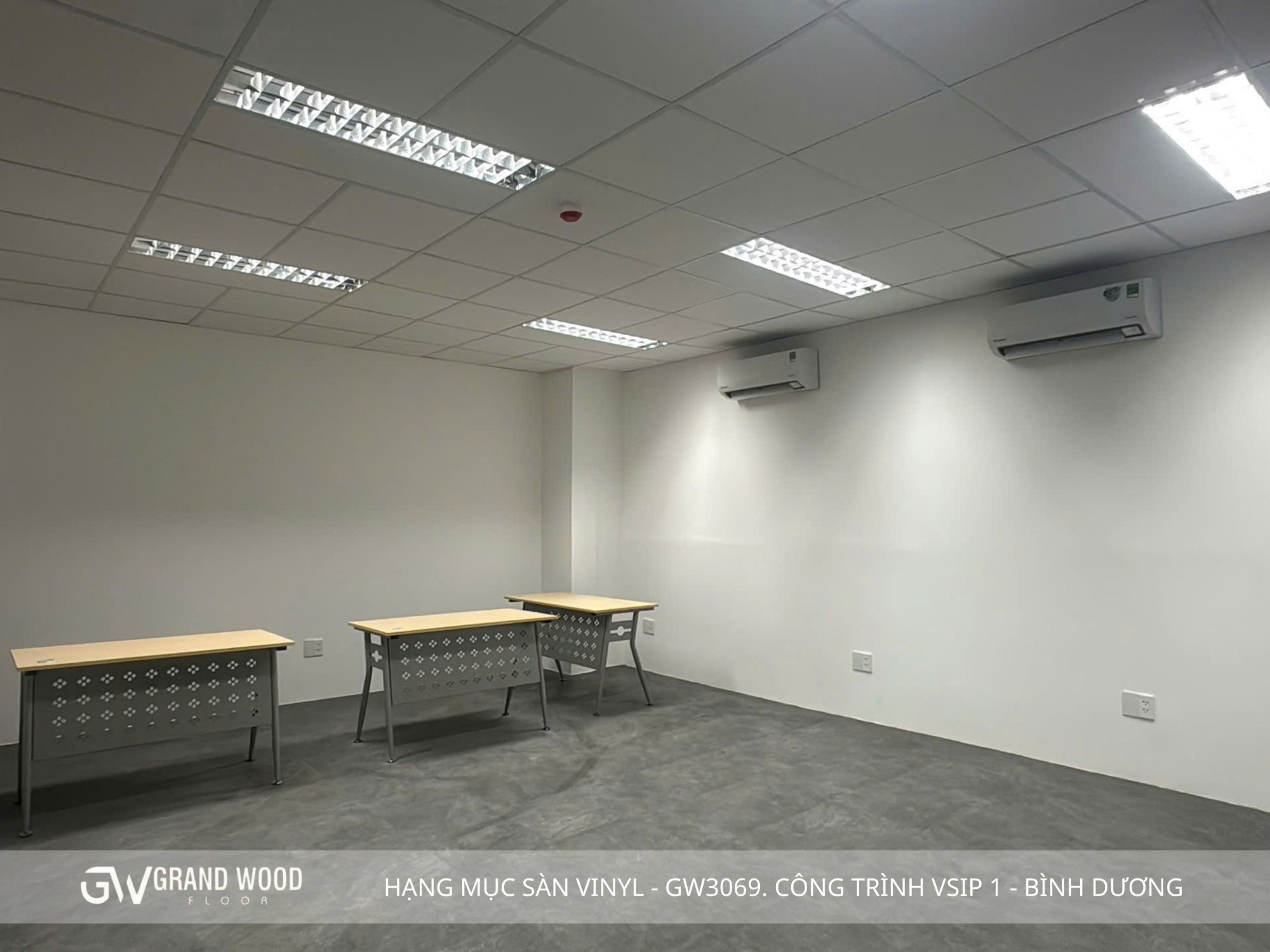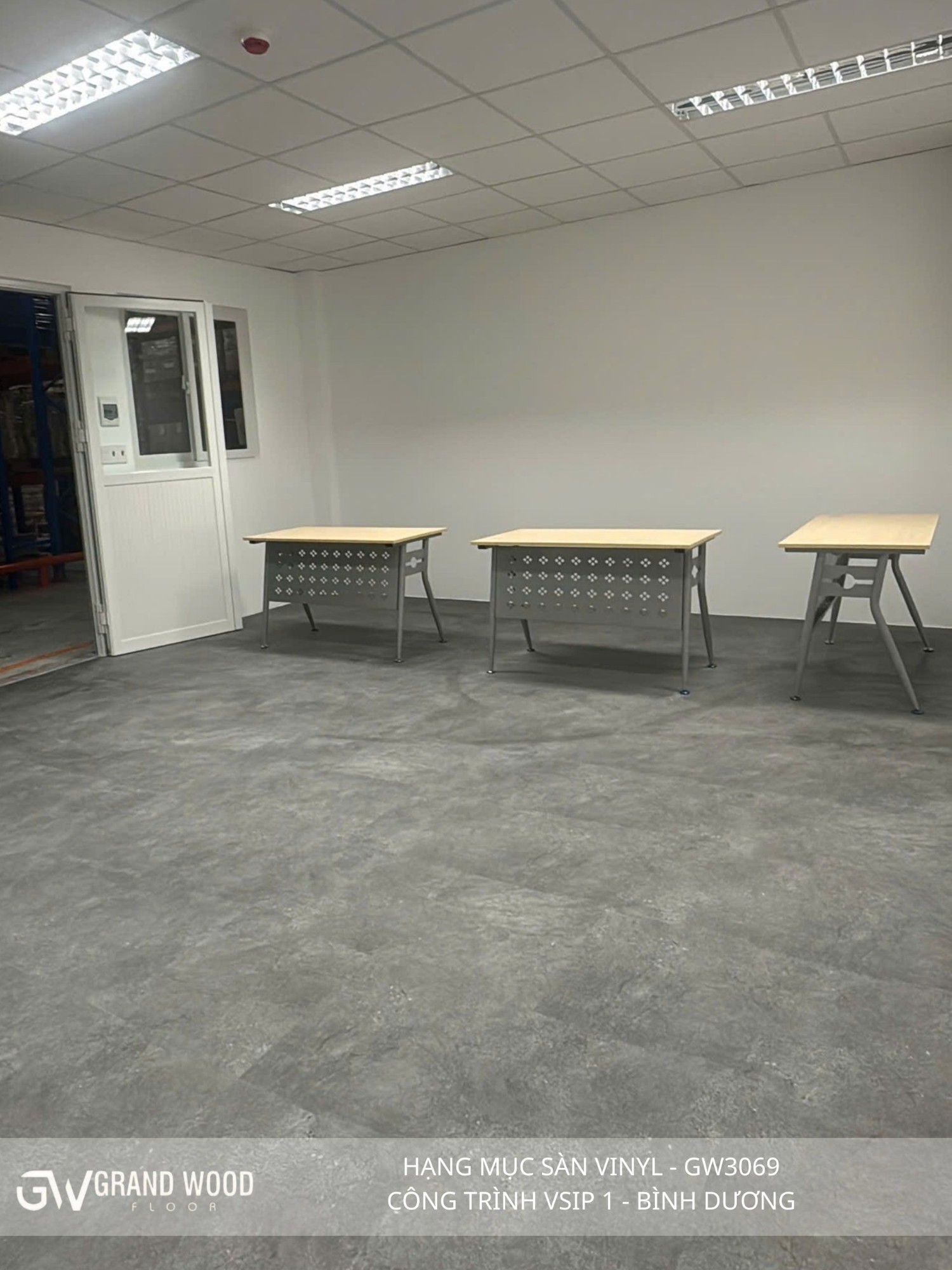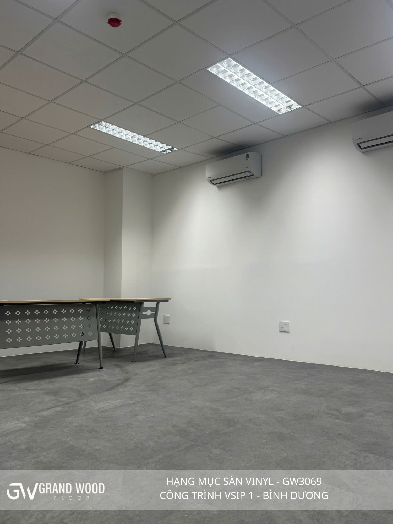 Một trong những dự án nổi bật sử dụng sàn vinyl GW3069 chính là VSIP 1 – Bình Dương, khu công nghiệp quy mô lớn bậc nhất khu vực phía Nam. Tại đây, vật liệu sàn không chỉ cần đẹp mà còn phải đảm bảo độ bền, an toàn và tính ổn định trong điều kiện sử dụng liên tục. Tone xám xi măng của GW3069 mang lại cảm giác sang trọng, sạch sẽ và đồng nhất, giúp không gian văn phòng thêm phần chuyên nghiệp. Khi ánh sáng tự nhiên chiếu lên, bề mặt sàn phản sáng nhẹ, tạo nên hiệu ứng mát mắt và dễ chịu. Đặc biệt, trong các khu vực đông người qua lại như hành lang hay phòng họp, sàn vẫn giữ được độ phẳng và độ bền ổn định, hạn chế bong tróc hay trầy xước. Công trình VSIP 1 là minh chứng rõ ràng cho chất lượng và tính ứng dụng cao của sàn vinyl GW3069, góp phần khẳng định vị thế của dòng sàn này trên thị trường vật liệu hoàn thiện.