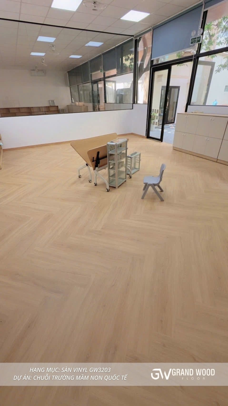 Trong các môi trường giáo dục mầm non, yếu tố an toàn và thân thiện luôn được đặt lên hàng đầu. Sàn Vinyl GW3203 là lựa chọn lý tưởng khi mang đến bề mặt mềm mại, êm ái và chống trơn trượt hiệu quả, giúp trẻ nhỏ thoải mái vui chơi mà vẫn đảm bảo an toàn tuyệt đối. Màu gỗ sáng tự nhiên cùng họa tiết vân gỗ nhẹ nhàng của GW3203 tạo nên cảm giác ấm áp, gần gũi, giúp không gian lớp học trở nên dễ chịu và tươi sáng hơn. Ngoài ra, sàn còn được thiết kế theo dạng xương cá tinh tế, tạo hiệu ứng thị giác sinh động, giúp căn phòng vừa hiện đại vừa sang trọng. Với khả năng chống bám bẩn và dễ vệ sinh, sản phẩm này phù hợp cho môi trường nhiều hoạt động như trường mầm non quốc tế – nơi trẻ nhỏ cần một không gian sạch sẽ, an toàn để phát triển toàn diện.