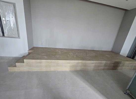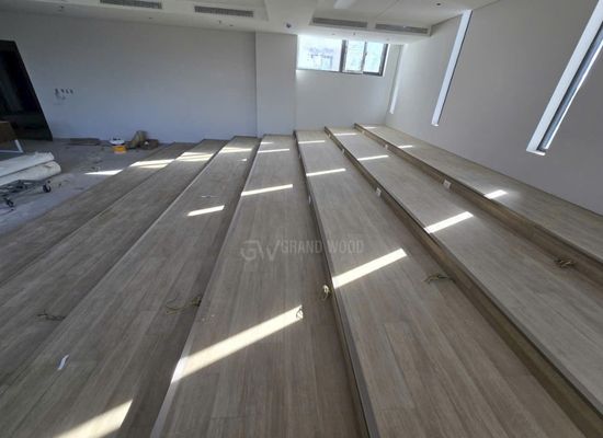 Hệ thống bậc ngồi và bục sân khấu được ốp vinyl vân gỗ sáng màu, vừa tạo điểm nhấn thẩm mỹ, vừa đảm bảo tính an toàn khi di chuyển. Nhờ tính năng chống trơn, chống trầy và kháng khuẩn, khu vực sử dụng luôn sạch sẽ và dễ bảo dưỡng, đặc biệt phù hợp với môi trường tập trung đông người. Không chỉ dừng lại ở yếu tố kỹ thuật, Grand Wood còn chú trọng vào giá trị cảm xúc – giúp không gian trở nên gần gũi, ấm áp, tạo cảm giác thoải mái và chuyên nghiệp cho người sử dụng.